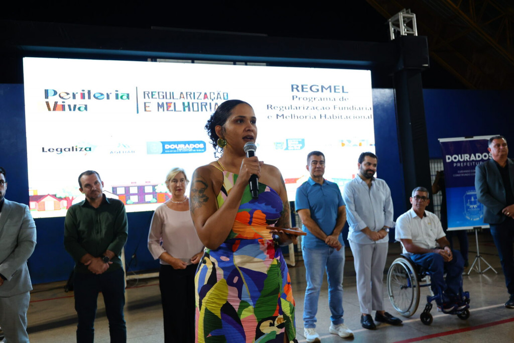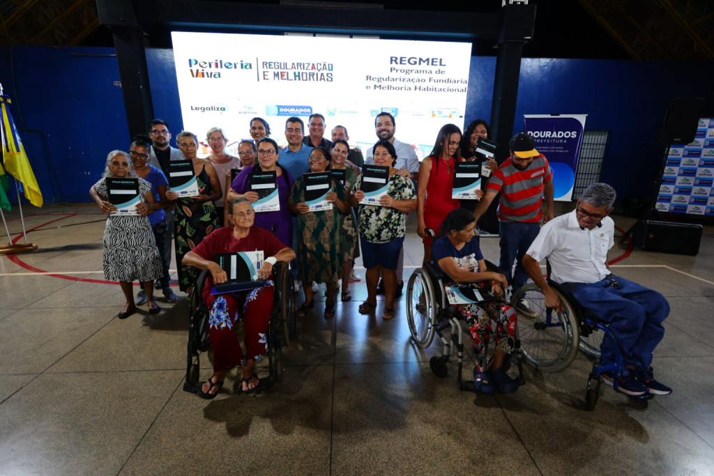 A Prefeitura de Dourados realizou na noite desta terça-feira (31) a entrega de 120 títulos de regularização fundiária para famílias do município. A cerimônia aconteceu na Escola Municipal Arthur Campos Mello, na Vila Cachoeirinha, e também foi marcada pela assinatura da ordem de serviço para reforma de 30 moradias, dentro do programa Regularização Fundiária e Melhoria Habitacional (Regmel). O evento contou com a presença do prefeito Marçal Filho, da diretora-presidente da Agência Estadual de Habitação, Maria do Carmo, do diretor-presidente da Agência Municipal de Habitação de Dourados, Eder Felipe, e da coordenadora-geral de Articulação e Planejamento da Secretaria Nacional de Periferias do Ministério das Cidades, Luana Alves.
