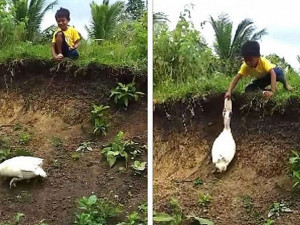 Uma situação estranha e engraçada aconteceu uma aldeia nas Filipinas: um pato devolveu a um garoto, o chinelo...